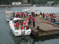 私は九十九島の清掃に合流しました。救命用具をつけてボートに乗り込みます。