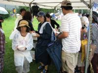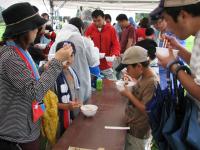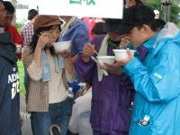 ふるまい鍋を食べているみなさん。寒くなった体を温めてくださーい。