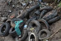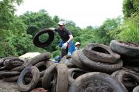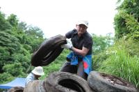 タイヤを積み上げる健さん。