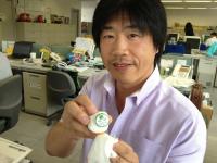 大明神のバッチにあやかろうとする岩崎さん。