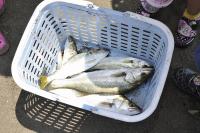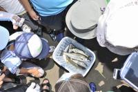 大人も子どもも興味津々。時々カゴの中で跳ねる魚に歓声が上がりました。