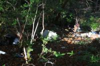 車を止めて「ゴミを捨てないでください」の看板の所に向かうと、その奥の斜面はご覧の状態。まるで山肌に流れる「ゴミの沢」です。それが約100m続いているように見えました。
