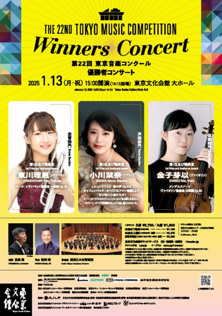 「第22回東京音楽コンクール優勝者コンサート」は、2025年1月13日(月・祝)に東京文化会館大ホールにて開催されます。