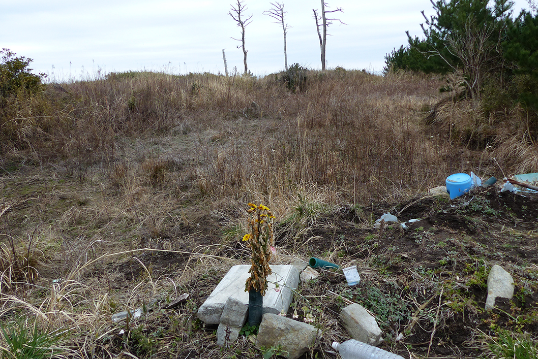 「ここです…この土手の下あたりから見つかったんです。震災の年の5月下旬、2週間ぐらいここで自衛隊が片付けと捜索をやったんです。片付けといっても瓦礫を持ち出して処分するのではなく、何か所かに山にしておいたんですね。ここがその一か所で。そこから遺骨の一部が見つかったと言う。だから想像でしかないんだけど、自衛隊に気がつかれずにがれきと一緒に運ばれて、その間にバラバラになっちゃったのかなと思っているんですけど。(ここで遺体の2割が見つかった?)そうです。だから残りがどうなっちゃったのか。