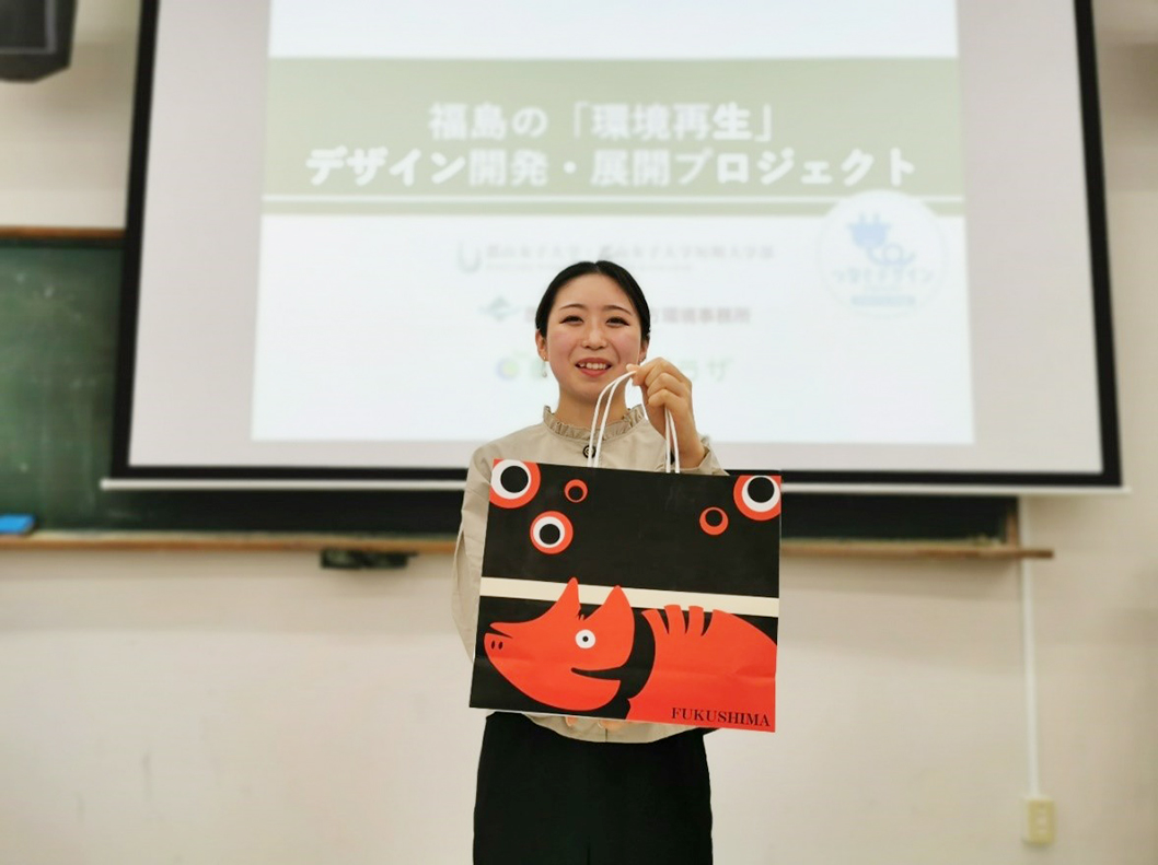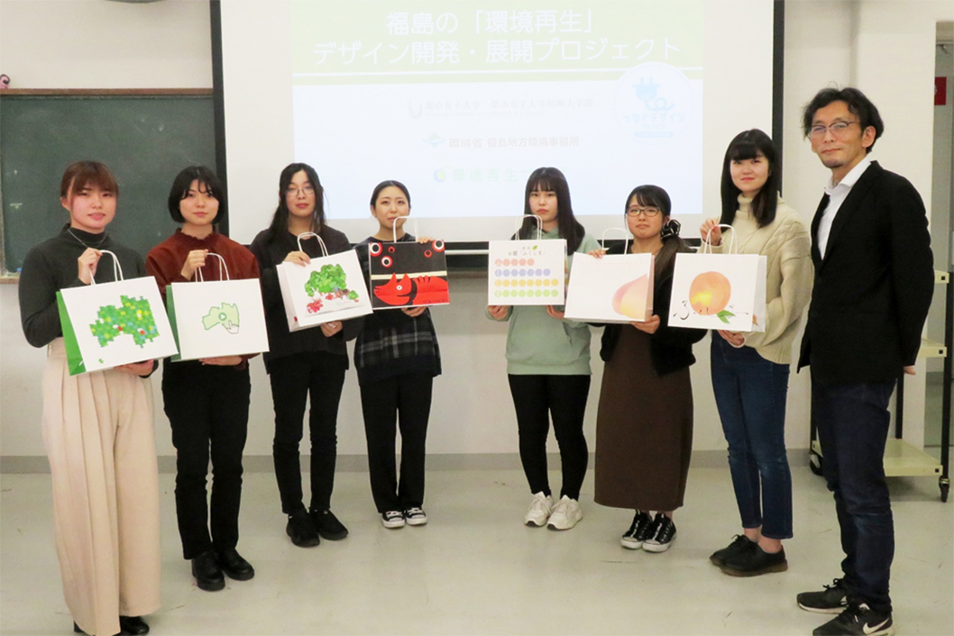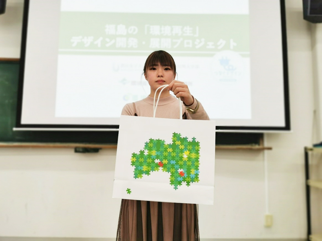 福島県郡山市の郡山女子大学短期大学部地域創成学科は、地域連携教育を中心とした多様な学びによって、創造力や表現力、コミュニケーション能力を伸ばすことを目的とした学科です。この「地域創成学科」が環境省と連携、福島の「環境再生」を想い起こさせるデザインを、7人の学生とともに開発しました。一枚目の写真は、そのデザインを施した紙袋を手にした学生たちの姿。学生たちはそれぞれ、福島の「環境再生」について深く考え、胸に浮かんだ思いをデザインに込めました。