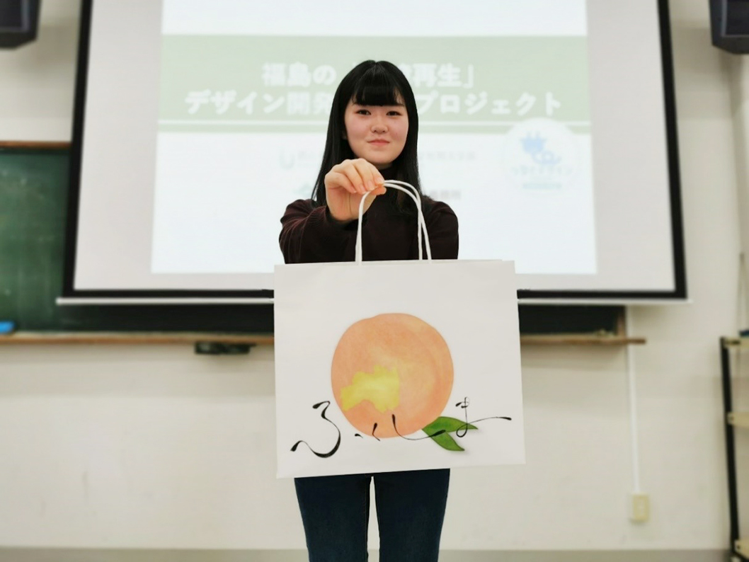 私は福島の食べ物を中心にデザインしました。郡山に農家をやっている祖母がいまして、風評被害で全然お米も野菜も売れないし、とっても苦労したという話を前々から聞いていたので、絶対に食べ物を中心にデザインしようと思いました。私は桃が一番最初に思い浮かんだので、今回は桃を中心にデザインしました。