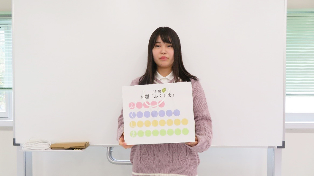 福島の環境について、文字だけで伝えられないかと思い、「ふくしま」で「あいうえお作文」を考えて、自分の福島のキャッチコピーをかけたらいいなと思ってこのデザインを考えました。」