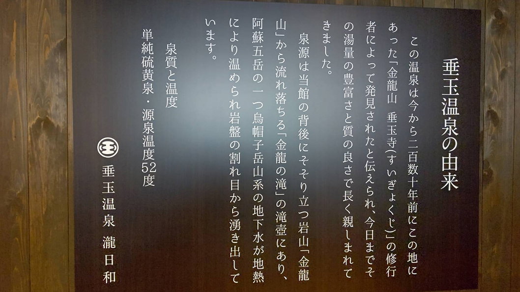 「新しい名前が『垂玉温泉 瀧日和』でこの春からスタートさせていただきます。まさに垂玉温泉のシンボルでもある「金龍の瀧」は何千年か何万年かの長い時間かけて谷が生まれて、そこに沸く泉源も滝壺にあるので、長い時間滝が流れ落ちる力で自然の掘削で徐々に今の温泉が出てくる地層までたどり着いて、今の温泉が出ている。垂玉温泉イコール“金龍の瀧からはじまる物語”が今に続いているのではないか、ということでこの名前に決めさせていただきました。」