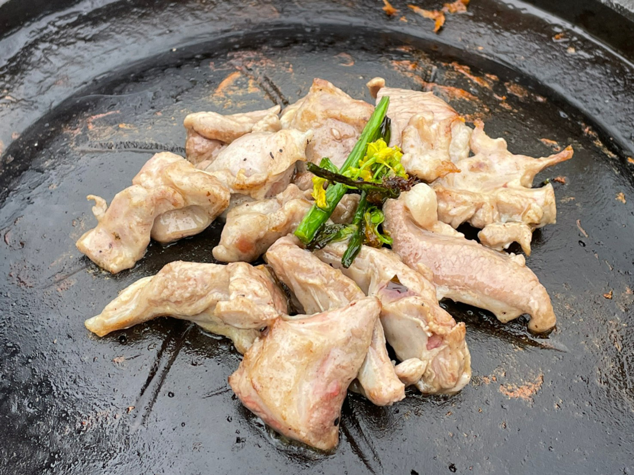 さとう農園が育てたひつじのお肉を、タカナードや高菜漬けを添えていただきました〜!これ涙が出るくらい最高に美味しかったです!