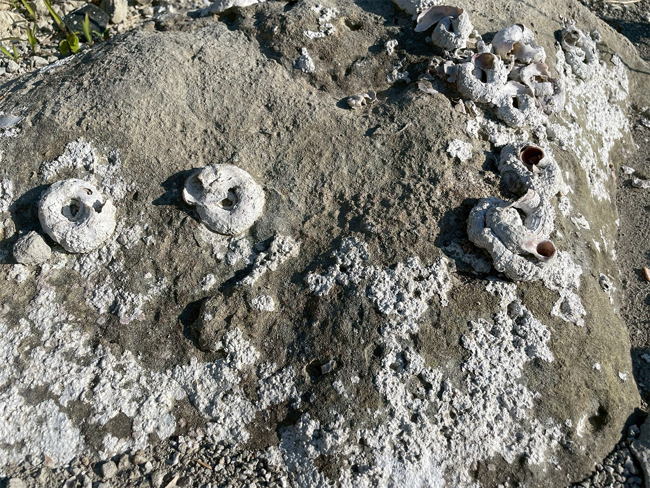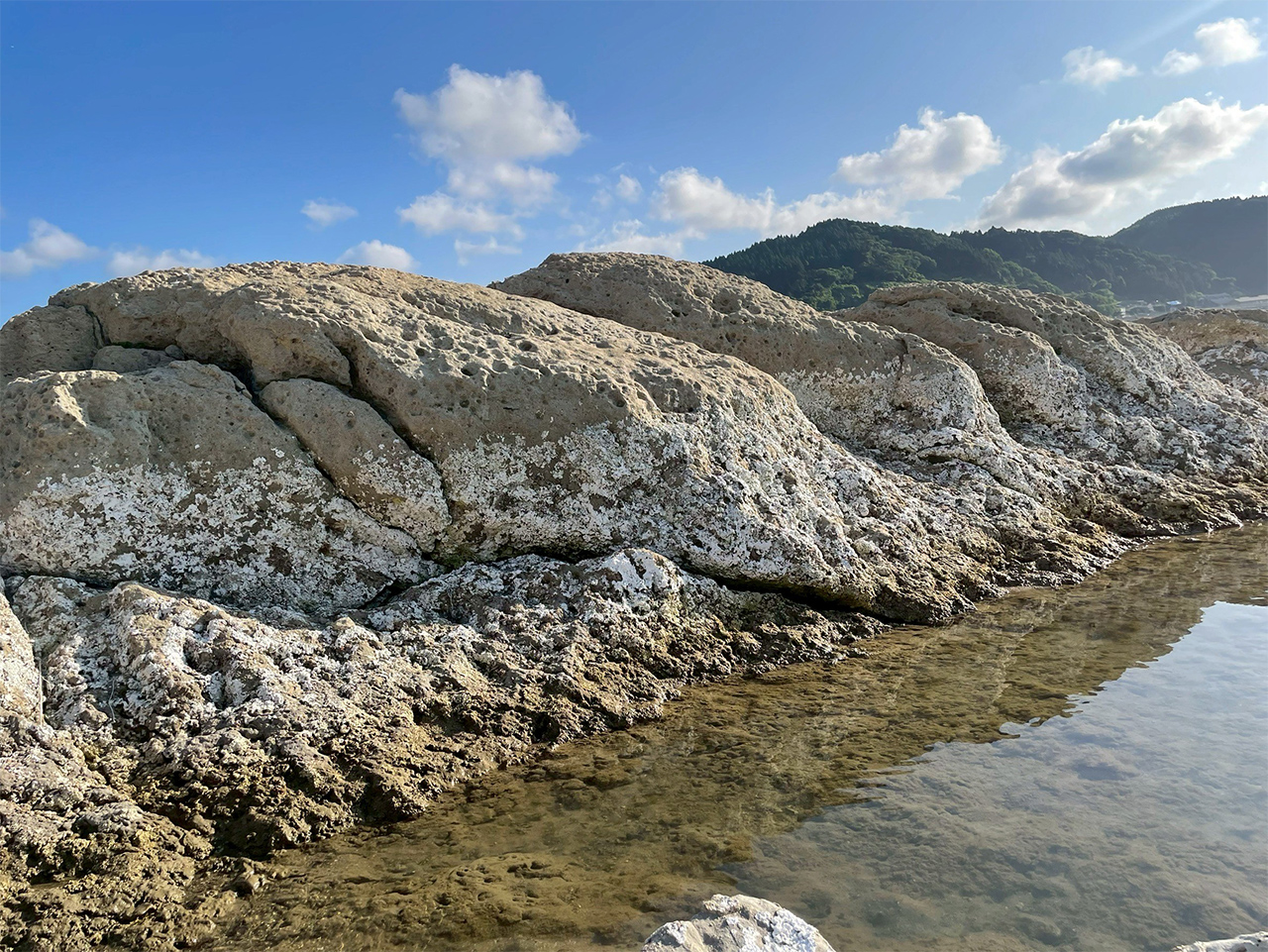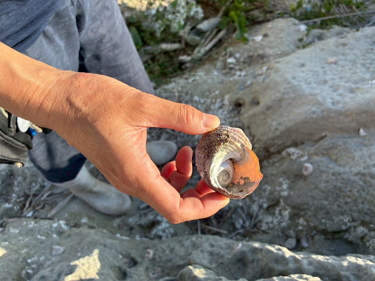 「この辺も海だったところですね。オオヘビガイという貝やトコブシ、サザエなどの死骸がそこらじゅうにある。もともと貝類は、海岸付近の割れ目を隠れ場にして住んでいる。海藻の死骸も震災直後はめくると、その下や岩の間に貝の死骸などが集中していた。それはおそらく、地震で揺れている間に海面が隆起したと言われていて、貝類は逃げ場を失って水分があるところに逃げ込んだのだと思う。岩の隙間や海藻の下に逃げ込んだけれど、結局は乾燥して寄り集まって死んでしまった。何万何十万という数が死んだということ。このあたりは海女さんたちのいい漁場だったんです」