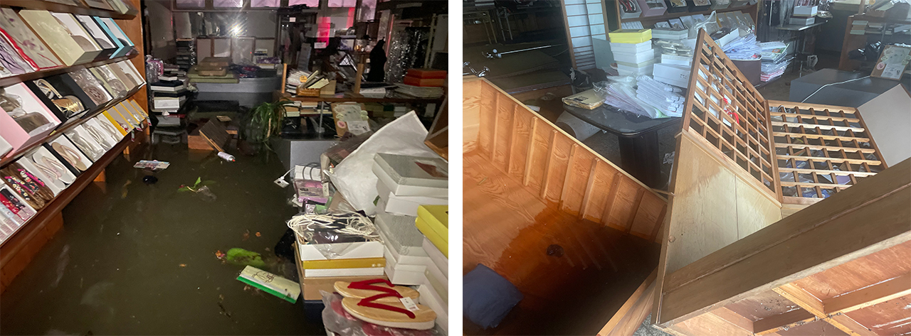 外に出てみると、家の目の前にあるアンダーパスに1台、車が突っ込んでいました。それから20分、30分経つにつれ、どんどん水位が増して“これはいつもと違うな”と。それで店の商品は1階にいろいろあるので机の上に上げたんです。道路から店舗までは大体40cmくらいかさ上げしているんですが、その40cmが20分ほどで水に埋まったので“これでも危ないな”と思い、机の上に上げた荷物を2階に上げました。最終的には水位は90cmくらいまで行きました。それが11日の夜中の2時ぐらい。