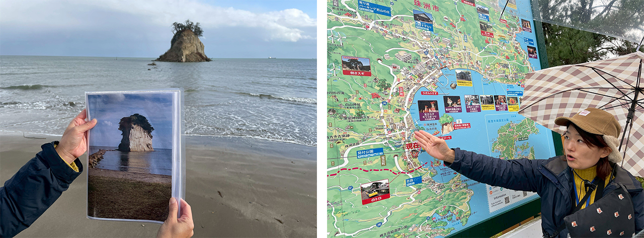 「ここ珠洲市宝立町は能登半島地震で津波の被害を受けた地域です。2〜3メートルの津波が到達しました。ご案内するのが観光名所、見附島です。地震の影響で大きく形が崩れてしまった島です。ここを見学した後、宝立町の仮設住宅、避難所となった学校、津波が到達した商店街をご案内します」