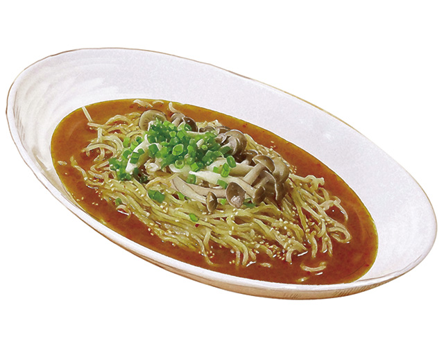 都賀西方PA(上) きのこの冷し旨辛麺 栄養満点なきのこがトッピング! この一皿で夏バテ知らず!きのこのビタミンB群×スパイスが代謝を高めて夏バテを予防!スパイシーな香りで食欲もアップ!¥680(税込)Web都賀西方PA(上)