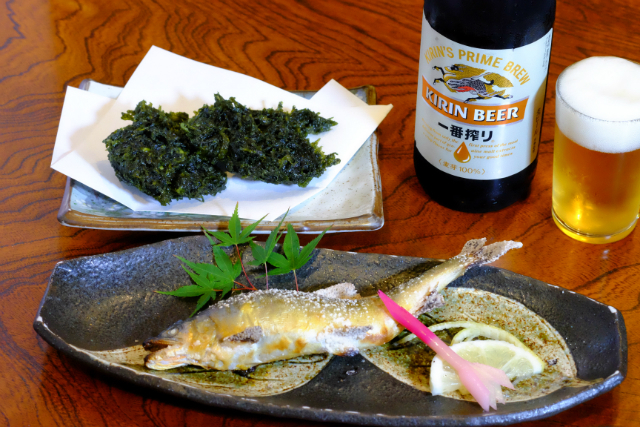 清流育ちの鮎は、澄んだ味の一番搾りと息もぴったり。