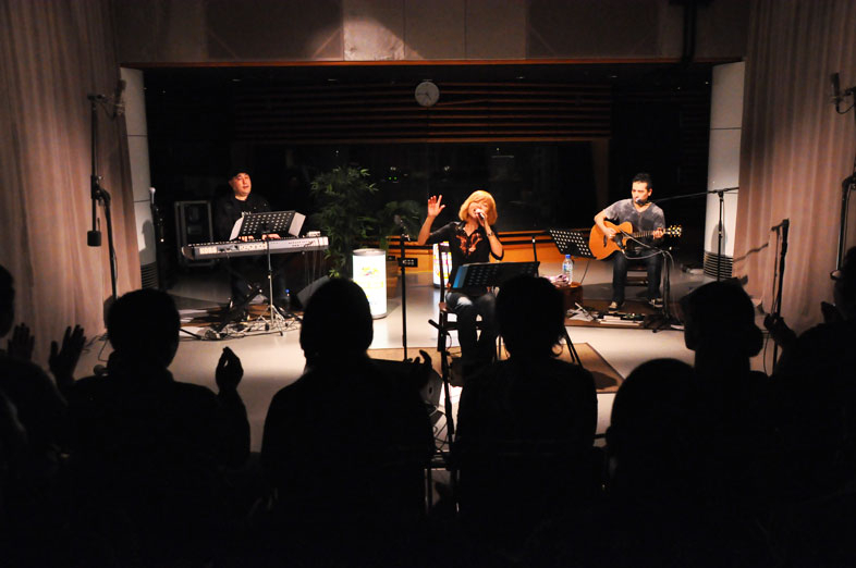 アコースティックのシンプルな音の中で際立つ、田村さんの歌声がスタジオに美しく響きます。