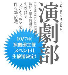 ![]() 文化祭WEEK4日目!10/7(木)の生放送授業は、 満を持して演劇部スペシャル!!!! 恋愛部とのコラボで、 ラブ書き込みを元に即興再現ドラマを展開とのウワサ! ついに新生・演劇部が、その実力を見せつける時がやってきたぞ――!!! 詳しい詳細は生放送を待て! |