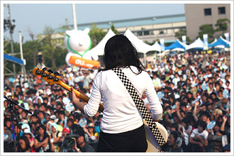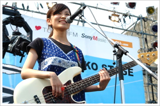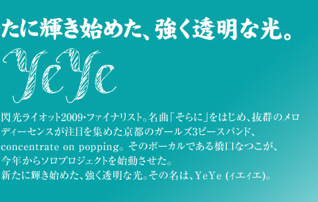 ![]() 閃光ライオット 最初は、ギターのとみなはん (トミナカナミ) が応募しようって話を持ってきてくれて。ドラムのともさん (イワタトモミ) とうちは、あんまりそういうのにもともと興味なかったんですけど、お金がもらえるって言われたから、「あ、お金ほしいー」って言って出てみたら、気づけばすごいところまで行ってしまって (笑) 。そこからいろんなつながりもできたし、自分にとって、すごく大きなきっかけになりました。最近は、閃光出身で活躍している人たちがたくさんいて。ウチよりも年下が多くて、すごいなーって思ってみてます。いずれは、つながりのある人たちとで、一緒に何かがやれたらいいなーって。そらに 映画「ソラニン」のコンピレーションアルバムに、「そらに」を大抜擢していただいたんですよね。すごいのに参加させていただいて、感謝してます。正式なお話をいただく前にメンバーの3人で、「『ソラニン』の主題歌が『そらに』やったらおもろいなー」みたいなことを言ってたんですけど、そしたらある日、本当に電話がかかってきて、びっくりしました。まさかと思って (笑) 。このつながりで、アジカンのゴッチさんとかが、YeYeのほうも応援して下さって。閃光に応募した頃からは想像できないですね。閃光の3次の時なんか、まだあの曲、2回くらいしか練習してなかったし (笑) 。 YeYe 去年から活動を初めて、今は、京都、大阪… たまに関東でも、ライブをしてます。concentrate on poppingは、ギターはギターが考えて、ドラムはドラムが考えて… という感じでつくっていて、それもすごく楽しいんですけど、自分一人で表現したいこともあって。YeYeの場合は、CDの音源は全部一人でいろんな楽器を演奏してます。 ソロに関しては、1年目は、“橋口なつこ”って本名でやってたんですけど、やっぱり、concentrate on poppingのソロではなく、全くの別プロジェクトでやっているということが表現できるように、新しく名前をつけようと。それでいろいろ案が出たんですけど、私は、AKB48が好き! みたいなのと同じレベルで、“おじいちゃん萌え”なので (笑) 、中国語で“おじいちゃん”という意味のYeYeという名前をつけました。 YeYeはまだ始まったばかりなんですけど、いろんな楽器を使ったり、いろんなジャンルの人たちと一緒にやったりしながら、一つのプロジェクトとして、いろんなものを表現していきたいなと思います。 みんなへ YeYeの名刺代わりに、音源をつくりました。3曲入り。このCDは、ライブハウス会場限定で売ってます。ちなみに、バッジもあります (笑) 。よかったら、よろしくお願いします。 あと、これから、梅雨入りですので、風邪を引かないようにお気を付け下さい。