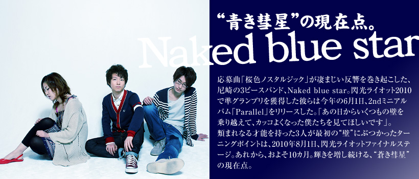 泉 明宏 (ボーカル&ギター) ―以下、“泉” 新尾 恭弘 (ベース) ―以下、“新尾” 松野 詩織 (ドラム&コーラス) ―以下、“松野” 1年目は2次審査で惨敗。 2年目は「調子に乗って、痛い目を見た」 泉 :「僕らが閃光ライオットに応募したのは、閃光ライオット2008の決勝に、Brack Topっていう、大好きな地元の先輩バンドが出てて。それを観て、『あんなすごい場所でできるんや』って。で、『俺らもやったろか』ってことで、2009年の閃光ライオットに応募したんですけど…」新 尾:「2次審査で惨敗 (笑) 」 泉 :「Brack Topには、2次審査で『お、いいね』みたいなことを言われたら行けるって言われてたんやけど… 行けなかった (笑) 。それから次の年、2010年の10月に、自主制作のアルバムを作ったんです。その収録曲の一つが、その頃から、周りのバンドマンとかライブハウスの人に評判がよくて。で、『これで行かれへんかったらもうアカンな』って言ってたんですけど… なんだかんだ、決勝まで行っちゃいましたね。その曲が、『桜色ノスタルジック』です。」 松 野:「まあ、さすがに今年は行けるんちゃうかって思ってたけど…… (笑) 」 泉 :「ぶっちゃけ、ちょっと調子には乗ってましたね (笑) 。でも、3次審査まで行って、初めてライブ審査に出てみると… やっぱりみんな、熱意とか、クオリティーとかもしっかりしてて。『あ、自分たちと同世代で、頑張ってる子らがこんなにもいっぱいおったんや』ってことに気づけたのが、すごく嬉しかったですね。それまでは、ライブハウスでやってても、先輩ばっかりで、横のつながりがあんまりなかったから、そうやってワイワイできるのが楽しくて。BURNOUT SYNDROMES (閃光ライオット2010ファイナルに出演。大阪出身の3ピースバンド) とは、閃光に出る前から仲がよくて、『一緒に決勝に行こうや』っていう話をしてて。結局、本当に一緒にファイナルまで行けたんで、すごく嬉しかったですね。ただ、何が悔しかったって言うと、何であいつらと同じ…」 新 尾:「同率で準グランプリやねんと (笑) 」 泉 :「そう! (笑) しかも、ファイナリスト発表の時にもカマかけられたんですよ。ファイナリストって、ラジオで、2日くらいかけて発表してたじゃないですか? で、先にあいつらが発表されてて。そしたらBURNOUT SYNDROMESのメンバーから『今年はもう、関西の枠はないらしいで』っていうメールが来て。それですっごい落ち込んでたら、ラジオで僕らの名前が呼ばれて… (笑) 。あの日の放送は録音してたんで、その後、何回も聴きました。聴いてるだけでテンション上がったんで。」 松 野:「ファイナル当日のことで覚えてるのは… 物販かなあ。ホント、めっちゃ並んでくれてたよね。開場した瞬間に、ダッシュで私たちの物販コーナーに並んでくれて。」 新 尾:「うん、ステージの前の方に行くとかじゃなくて、スグにこっちに来てくれて。」 泉 :「確かにこれ、めちゃくちゃうれしいことなんですけど、そうやって並んでくれたんで、実を言うと自分たちのLIVE以外、ほとんど見れてないんですよね。ずっと、CD買ってくれた人に『ありがとうございます!』って言い続けてて。」 新 尾:「他のアーティストが見られなかったのはもったいなかったけど、並んでくれるのは本当にありがたくて。」 泉 :「そうそう、あの日、初めて、サインというものを求められて。1日で多分、3〜400人くらい書いたんちゃうかな。うちわとかクリアファイルにも、サインをして下さいって頼まれて。1日でめっちゃ上達したよな、サイン書くの。」 松 野:「わかるわかる! サラサラかけるようになったよね (笑) 。あと、Tシャツに書いてくれってお願いしてくれる子もいて、自分で『なんかプロっぽい!』って思った (笑) 。嬉しかったな。」 泉 :「あ、この場を借りて、言わせて下さい。あの時は本当にみんな、ありがとうございました!」 松野&新尾:「ありがとうございました!」 泉 :「で、当日は……… 自分たち的には納得のいくLIVEができてなくて、すごく悔いが残った。野外でLIVEをやったのも初めての経験で、もうちょっと事前に対策を練っていろいろ準備をしとけばよかったなって。それこそホントに、余裕ぶっこきすぎて、痛い目をみたっていうか。ただ、1万2千人を前にして… あの景色はすごくよかったんですよね。だからこそ、めっちゃ悔しかった。あの景色を前にして、もっとできたはずやのに、ものすごいもったいないことをしてしまった。だから、出番の後はものすごいヘコんでたんですけど、それでも、『LIVEよかったです! CD下さい!』って声が途切れることがなくて。それを見ているうちに、落ち込んで、しょぼくれた顔をしている場合じゃないなって思いましたね。」 ファイナルステージでぶち当たった“壁”。 「頑張ってないのに、評価だけが上がっていってモヤモヤしてた」 泉 :「準グランプリをもらえたのは嬉しかったですけど、やっぱ悔しかったですね。グランプリじゃなかったか