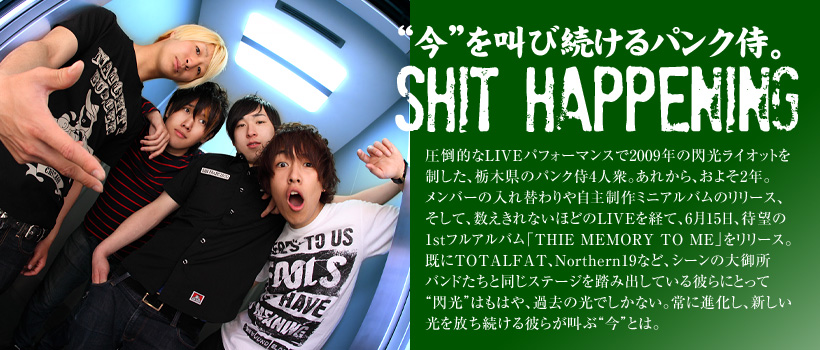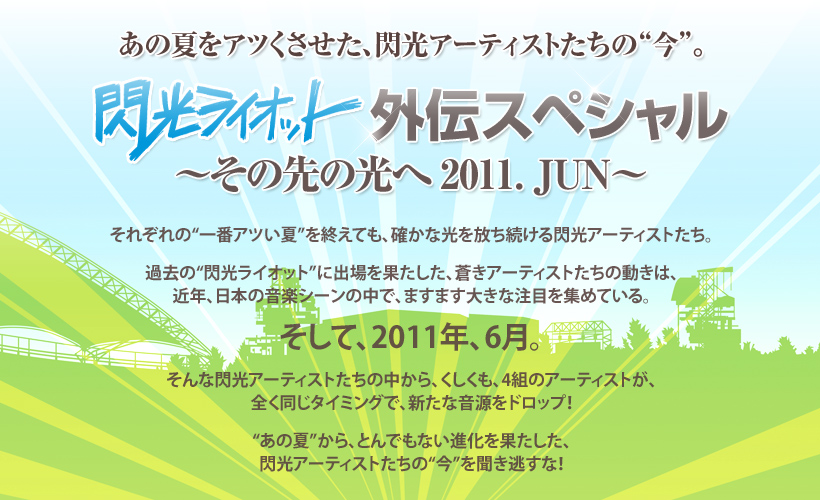 小野崎 建太(ボーカル&ギター)―以下、“小野崎” 梅田 貴之(ドラム&コーラス)―以下、“梅田” 閃光のファイナルステージは、「ツアーの初日」 小野崎:「閃光ライオットに応募したのは、とりあえず好奇心だよね。バンドをやってるからには、でっかいステージでやってみたい、みたいな。」梅 田:「オレ、2次審査、すげー覚えてるな。エライ人に囲まれて、何曲もやらされて…」 小野崎:「そうだ! そこで言ったんだ。『モテたくてバンドを始めました』って。アレ、本気で言った訳でもないのに、あとあと、スゲー持ち上げられたんだよね…。で、結局ファイナルでグランプリをもらった訳なんだけど。次の日起きたら何か変わってんのかなって思ったら、あんま変わってなかった。何にも変わってなくて、逆にびっくりしたな。でも、これから変わって行かなくちゃいけないなっていうのはあった。」 梅 田:「ライブ頑張んなきゃ、みたいなのはすぐに出てきたよね。実は、閃光が終わってすぐにツアーだったから、グランプリを獲ったからどうのこうの考える暇もなかった。もう、次の日は水戸でLIVEだったから。だから、閃光のファイナルがツアーの初日みたいな感じ。」 小野崎:「そっか、あれが初日だったのか。劇的な初日だね。ツアーは、水戸に行って、後は東京八王子、山梨、長野、群馬… で? 下北沢に戻って、次に新潟行って… みたいな感じだったよね。そういえば、もうその時あたりから、『Over』やってたね。」 梅 田:「そうだね、ツアーしながら曲も作って。でも、閃光がきっかけというより、同じタイミングでいろいろやり始めた時期だった。ただ、閃光で優勝してから、やっぱりお客さんは変わったよね。」 小野崎:「いろんな人が知ってくれるきっかけになったね。オレらはいつも通りLIVEやってるんだけど、なんかやっぱ、みんなからの見られ方は変わったんだろうなって感じたり。」 梅 田:「一つのハードルが付いちゃったっていうか。でも、だからこそモチベーションを高め合って、LIVEの回数を増やしたんだよね。」 小野崎:「とりあえずLIVEやったよね。とにかくLIVEをやって、曲を書いて。その繰り返し。」 仲間との別れ。新たな出逢いと決意。 「閃光は、メインの出場アーティストをイライラさせてやろうって。」 小野崎:「で、そのツアーのファイナルを地元でやったんだけど、そこで、ベースのトメ (バンドのオリジナルメンバー、五月女聡) が抜けるってなって…」梅 田:「うん、それがでかかったよね。それからすぐの期間は、もうどうしようかって感じで。でも、成り行きで、現・ベースの今瀬が入ることになって… オレ的には、今瀬が入ってやっと、『もっと上目指すか』みたいな気持ちが強くなった気がする。本格始動っていうのかな。もちろんその前から本気でやってたんだけど…」 小野崎:「改めて帯を締め直す、みたいな。」 梅 田:「うん。しかもその時から、去年出た自主製作のミニアルバムのレコーディングも始まってたしね。」 小野崎:「そっか。アルバムを作りながら、LIVEをやりながら… の、閃光ライオット2010だ (2009年のグランプリバンドとして、オープニングアクトに登場)。あの時は、メインで出る人をイライラさせるぐらいアオってやろうって。オレたちも、前の年に優勝したガリレオのオープニングアクトを見て、『これに負けないくらい頑張ろう、爪あとを残してやろう』っていうのがあったじゃん? だから、オレたちも散々アオってやろうって気持ちはあったな。」 梅 田:「爪あとはいつも、残したくて仕方ないよね。」 小野崎:「ギャッ! とね。2010年のバンドも観てて面白かったなー。本当にバラエティー豊かで、『この人、普段どんな音楽聴いてるんだろ?』みたいな人がたくさんいたり。」 梅 田:「あと、オレたちは、いくら去年グランプリを取った人って言っても、普段はまだ、“駆け出しのバンド”みたいな扱いをされることも多いじゃん? そう考えると、出場アーティストのみんなに対しては、“でっかいステージで対バンできる仲間”って意識はあったけどね。」 小野崎:「そうだね。ただ、仲良くなる気でいたけど、結局誰にも近づけずに終わった (笑) 」 梅 田:「人見知りバンドだからね、オレら (笑) 。仲良くして下さい、っていう。」 小野崎:「オレらはいつでもオープンマインドなんだけどなー。」 梅 田:「でも、2010年の閃光ライオットも本当に、“LIVE”だったよね。オレたちもゲストみたいな扱いじゃなくて、一緒に作った感じだったから、すごく楽しかった。」 TOTALFAT、Northern19… 憧れのバンドが対バン相手。 「閃光ライオット? そんな時もあったかな、みたいな」 小野崎:「最近は、ガリレオとかねごととか、閃光に出てた人たちをテレビとかで観る機会が増えて来たけど… オレたちも相変わらず、LIVEをして、曲を書いての繰り返しだけど、それはそれは、充実した日々を送ってるよね。」梅 田:「うん。閃光でグランプリを獲ると、