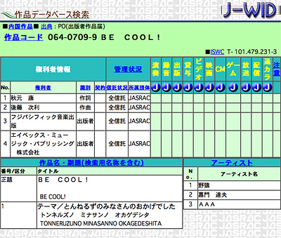 すごいでしょ。ここを見れば、その作品が、どう管理されているか、スグに分かるようになっているんだ! ちなみに、野猿の楽曲は、作詞に、今はAKB48のプロデューサーとして有名な、秋元康さんも参加! そして、作曲には、これまた、AKB48の楽曲の一部に参加している後藤次利さん! いや〜、豪華な作家陣だったよね!