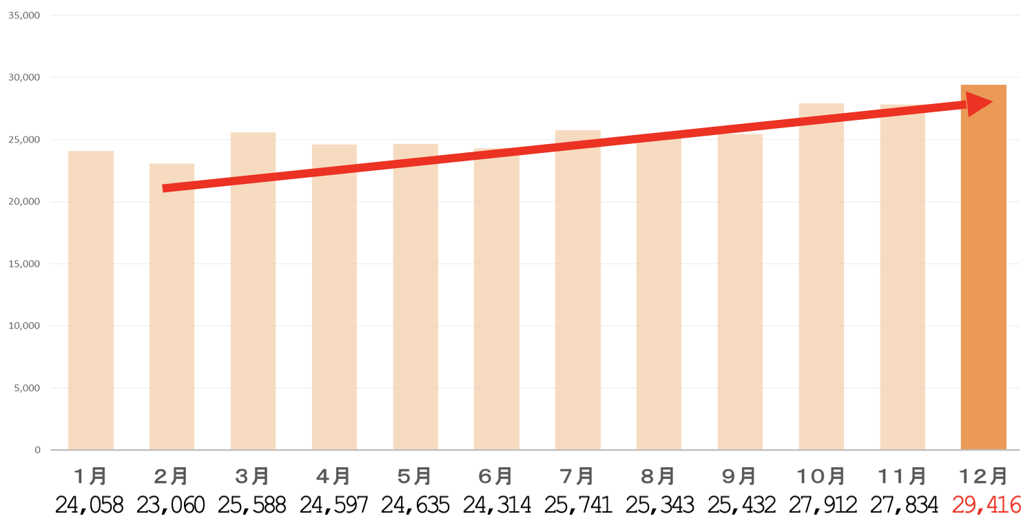 2023年のデータを見てみると12月は約29,400件と一番多く、一番少なかった2月と比べて約1.3倍も多くなっています。