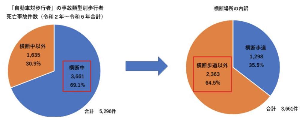 自動車と歩行者の交通死亡事故の多くは、歩行者が道路を渡っているときに起こっています。