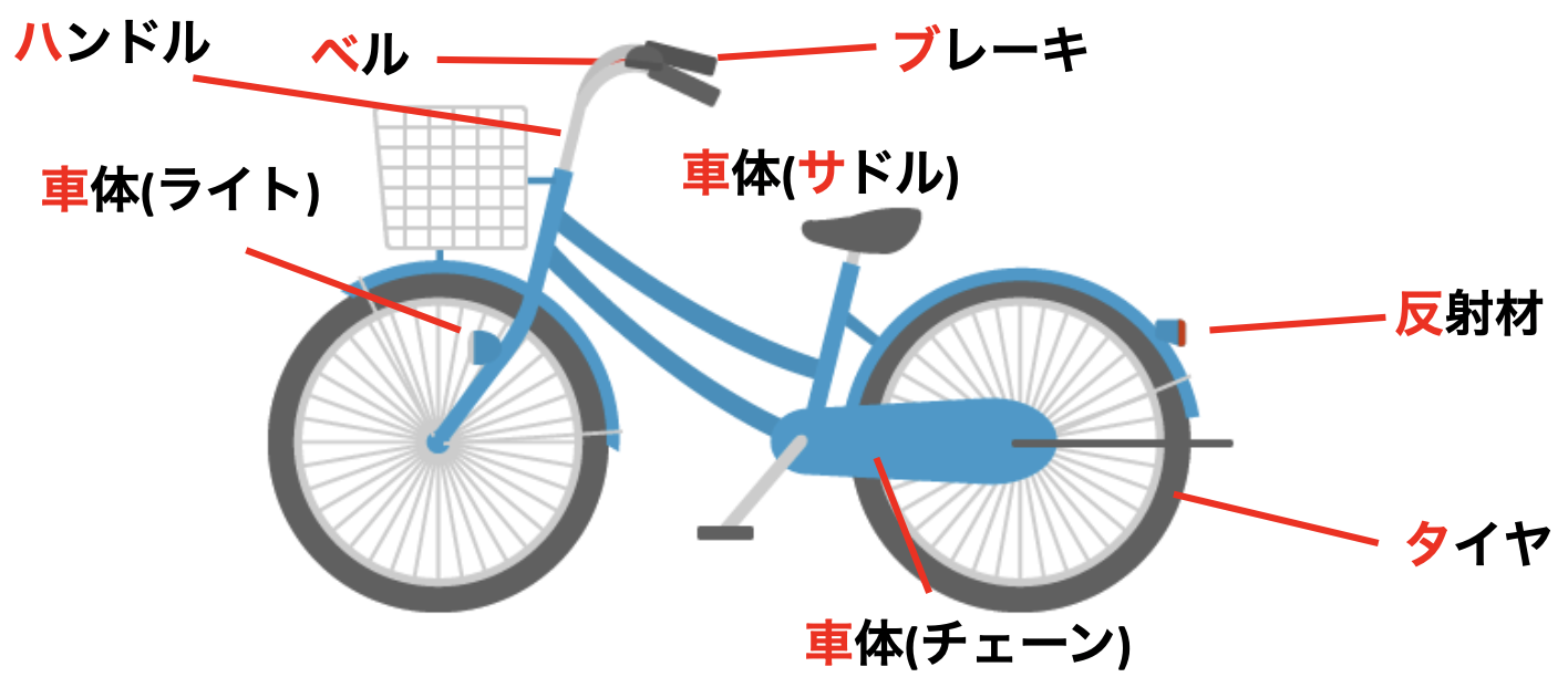 この合言葉が指す自転車パーツはブレーキ、タイヤ、ハンドル・反射材、車体、あと1つはなんでしょう。