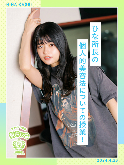 そして今夜は、私の個人的美容法についての授業をしていきます。“ビューひな”こと、景井ひなが、10代のトレンドをSCHOOL OF LOCK!の生徒と研究していく、ビューひな総研、所長の景井ひなです!!こんな書き込みが届いていたので紹介します。」