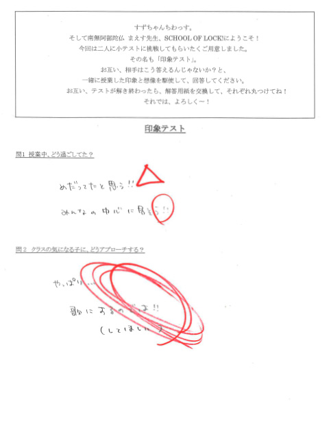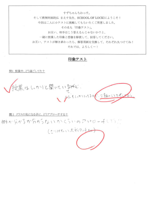すず「今日もおねがいします!昨日の授業を聴いていなかった生徒の方たちに説明すると…昨日の授業が終わる直前に謎の小テストが教室に投げ込まれてきまして、私たちいま解き終わりました!私たちが解いた小テストは…『印象テスト』!説明文があるので読みますね…」