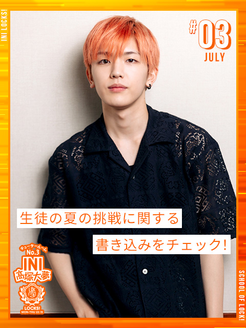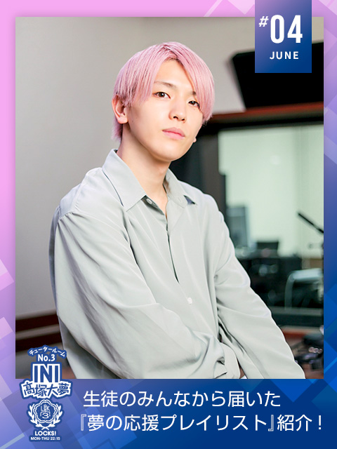 大夢「INIもデビューして3年目に入りまして、あっという間ですね、本当に。結成して、すぐに韓国に行って、気づけば11月3日デビュー日を迎え・・・そこからは沢山いろんなステージに立たせていただいて、沢山いろんな国に行かせていただいて、目まぐるしい2年間でしたね。あっという間ですね、僕も24歳なんですよ。SCHOOL OF LOCK!に初めて出た時は22歳ですね。だからもう2年間ぐらいもやってるわけですよ!成長しましたかね?(笑)早速、ちょっとオープニング噛みましたけどね。相変わらず噛んでしまう癖は健在でございます(笑)そんな中で、3年目やっていきますけど、たくさん生徒のみんなとも、ずっとお話も続けているわけで、たくさんたくさん生徒の夢をサポートしていければいいかなと思います!ということで、3年目もSCHOOL OF LOCK!「INI LOCKS!」しっかりやっていきます!SCHOOL OF LOCK!のように長く愛されるように、これから僕も頑張っていきたいと思います!!」