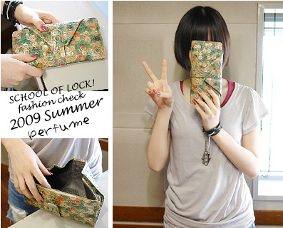 夏のオシャレ・アイテムっていうか、オールシーズン行けちゃうっていう財布です。皮にボタンの型押しがしてあって、色が独特で。