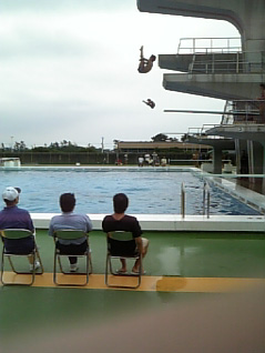 手前で飛んでるのが自分です。これはシンクロと言って二人でタイミング合わせて飛ぶ競技です。