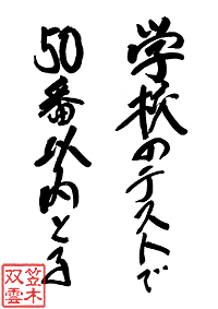 ![]() 字を引く書なり。 新潟県 16歳 男 今回の大会で決勝進出しないと、県大会出場ができません。 そうなると、先輩達に迷惑がかかってしまってうんです。それだけは絶対にしたくないので、自分の魂に『入魂!!』しました!! |