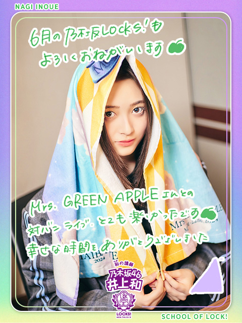 和「この曲はMrs. GREEN APPLE先生で『青と夏』です!そろそろ授業終了の時間になりました。井上和の乃木坂LOCKS!では、私への質問、相談、報告、ライブの感想やミーグリの感想など、何度でも自由に受け付けています!乃木坂LOCKS!井上和宛のページから書き込み、メールをお待ちしています。Xでのポストは『#乃木坂LOCKS』でお願いします!