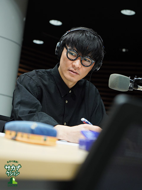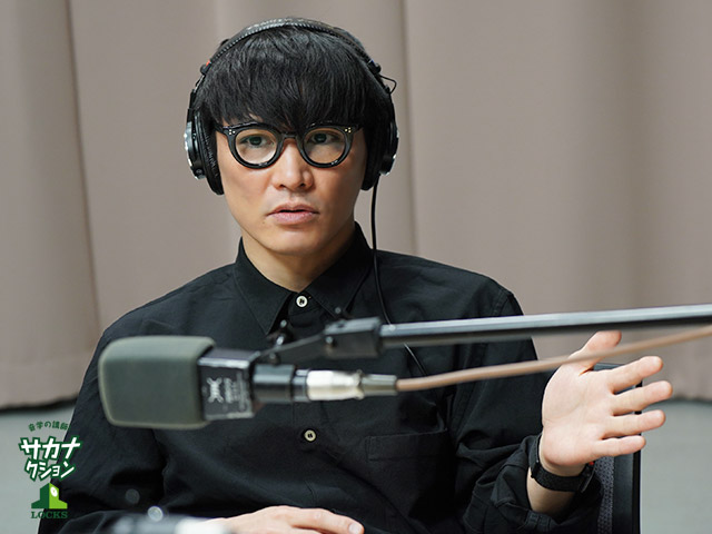 「これね……崖っぷちだから、サカナLOCKS!。どんどん新しい講師陣が入ってきてだな、[Alexandros]先生も金曜日にきて、先生イチオシの……みんながギャーギャー言い出す前から、あの島根のバンドに唾つけていた(笑)、ヒゲダン先生(Official髭男dism先生)も入ってきちゃったわけだよ。サカナLOCKS!は9年目に突入したんですけど、崖のギリギリで、スニーカーの半分くらいまでは崖だからね、今。ぜひ応援をお願いします。この時間は、"音を学ぶ、音に学ぶ、音で学ぶ"、『音学(おんがく)』の授業を行っております。他の講師は知らんが、このサカナLOCKS!は特別です……何かと言うと、これから話をしていくよ。」