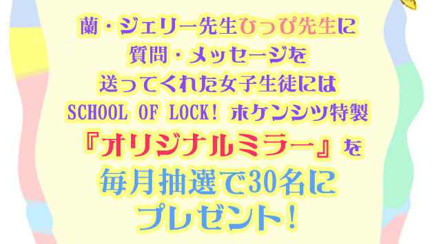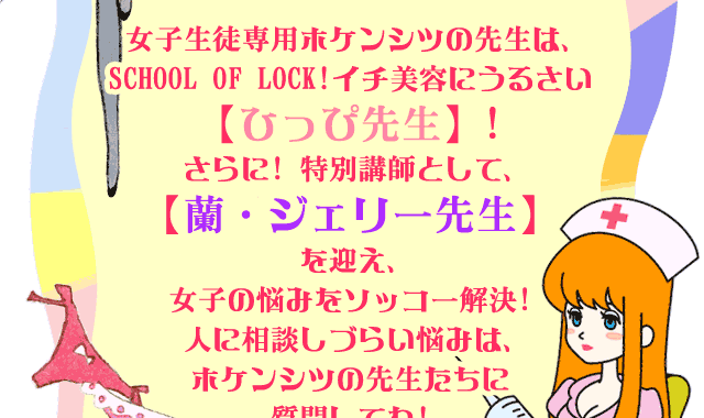 これまで12週にわたって、この女子生徒専用ホケンシツでSCHOOL OF LOCK!の女子生徒のみんな質問を答えたり、色々とつぶやいていたけど、アタシとは今日でいったんお別れ…。