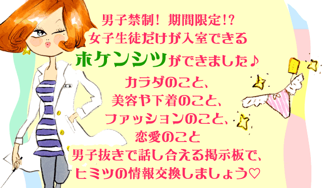 ホケンシツ掲示板で生理不順や生理痛、おりもの、下着、脱毛、お化粧、肌のお手入れ、恋愛など・・・