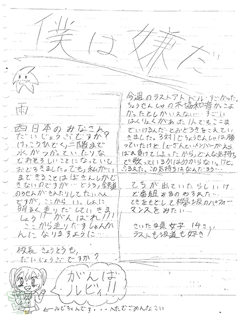 西日本の皆さん昨日までの大雨でとても大変だと思います。僕たちが東日本大震災の時皆さんの励ましのおかげで前に進むことができました。今は僕たちが西日本で頑張っている皆さんに勇気を与える番です。こうやってラジオの前で皆さんを祈ることしかできませんが僕たち日本の心は繋がっています!みんなでこの困難を乗り越えましょう!がんばれ!西日本!