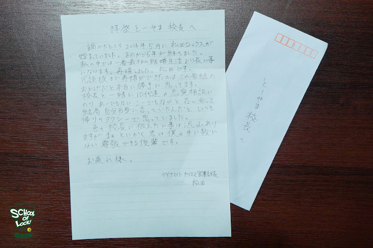 5年ぶりに手紙を書いたという生徒 RN[夢の中の管理人]は、SCHOOL OF LOCK!を聴き始めてまだ1年未満だけど毎日の授業を聞いて感じた思いを手紙にしたためて校長へ向けて電話越しに(途中まで)読み上げてくれました。