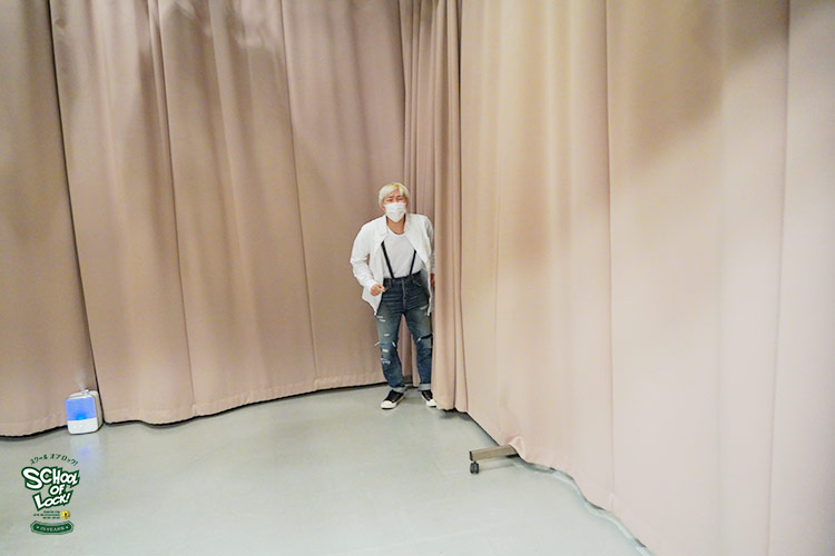 ここは、SCHOOL OF LOCK!の『音楽室』。先生たちがライブとかもやったりできる教室から、生放送授業をしていこうと思う。聴いている生徒のみんなは広さをわからないかもしれないから、どれぐらい広いか、こもり教頭、大声出しながらはじまで行って戻ってきてよ」