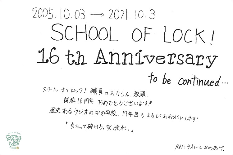 でも旅立つことは変わることじゃないと思う。今いる自分の場所を愛して大事に思ってそして広げていくことだと思う。だから未来の鍵を見つけてどこに君がいようが、変わらずここがラジオの中の学校です。だから今日登校してくれた生徒の君! 今日登校してくれたすべての生徒が、これから先一人ひとりのタイミングで闘わなくちゃいけない瞬間が来ると思う。SCHOOL OF LOCK!は校長、ぺえ教頭、職員全員で生徒の君に伝え続けていきたい。