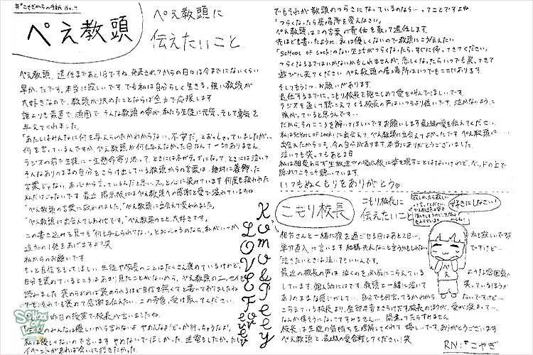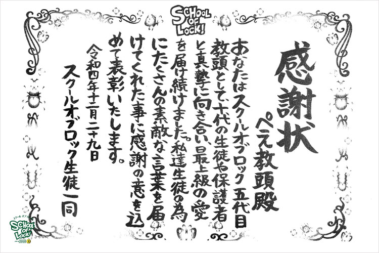 ぺえ教頭「みんなこれからもSCHOOL OF LOCK!捨てないでよ。そして校長のことも支えてあげてよ。私がもう支えてあげられないからね」
