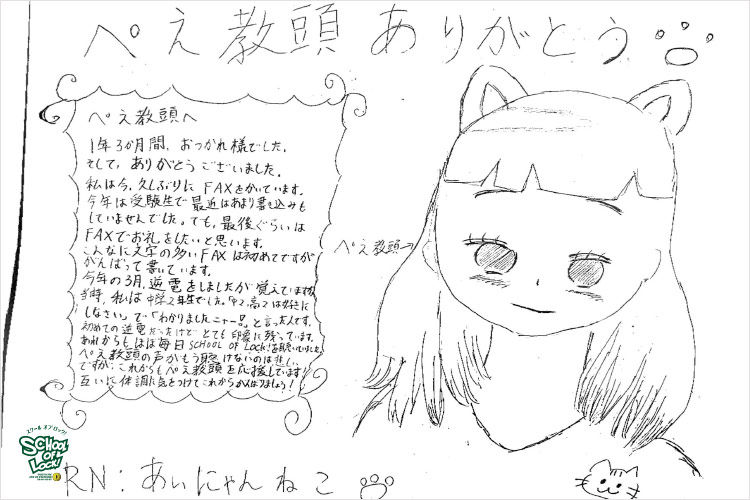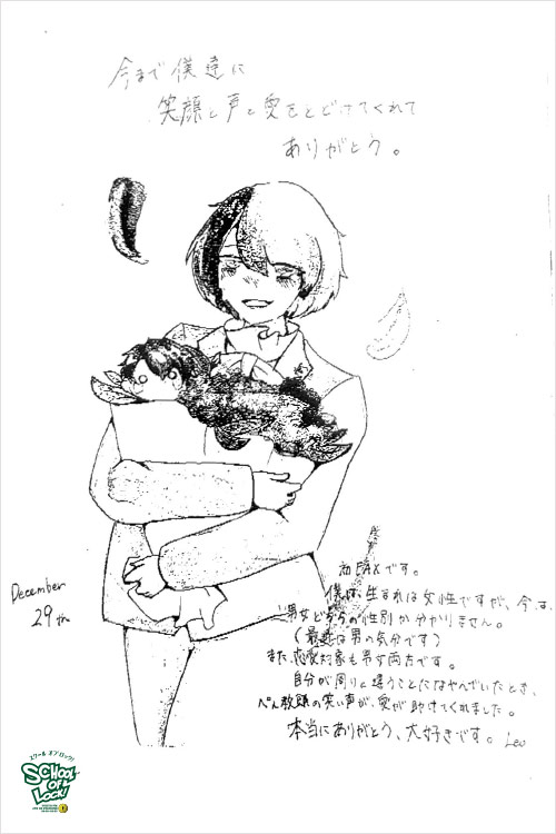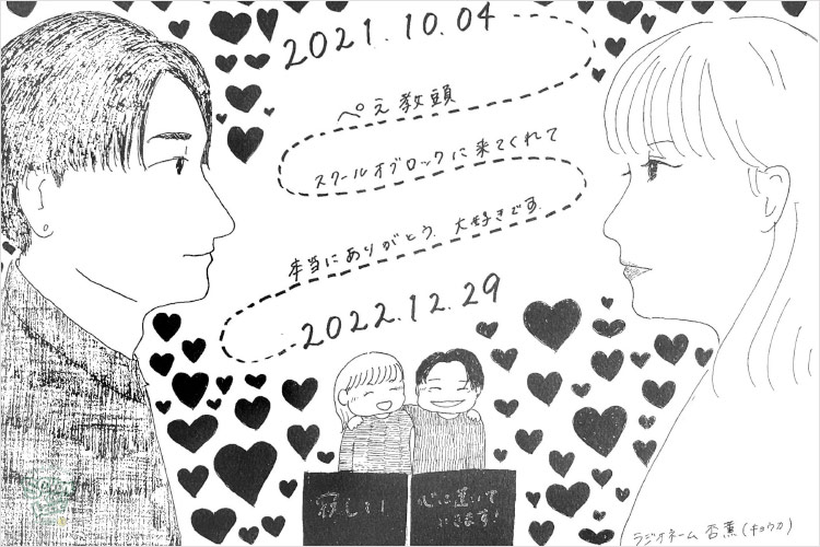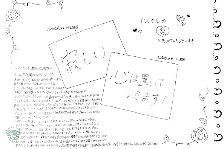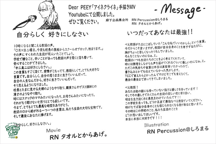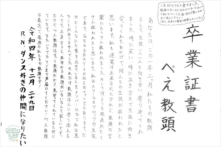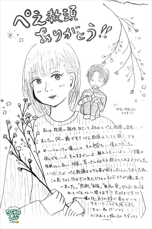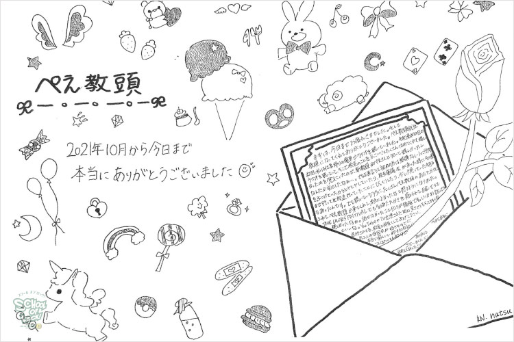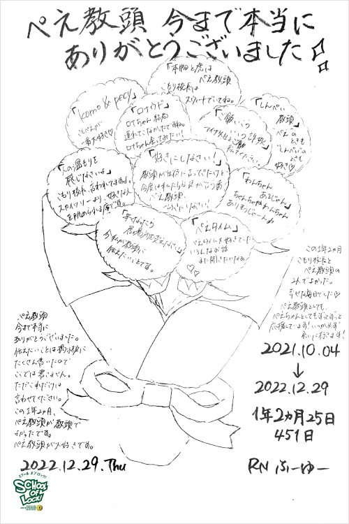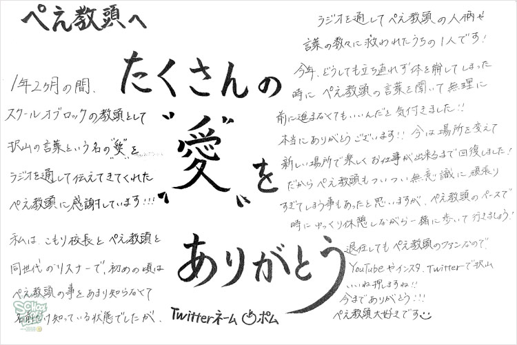ぺえ教頭、無償の愛をたくさんの生徒に届けてくれてありがとうございました。“想い”ってものは、目に見えないものだと思っていましたが、ぺえ教頭が届けてくれる“想い”は目に見えて、色があって、温度があって…どれも素敵なものばかりでした。