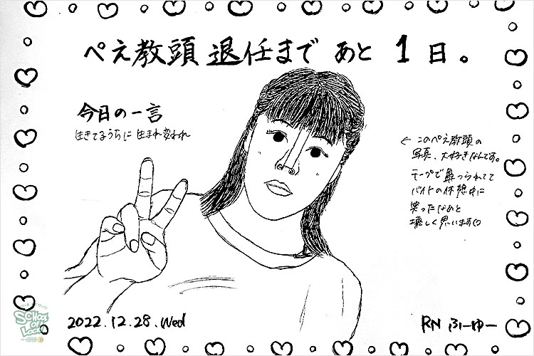 でも、この世界のどこかにいる教頭が、ペえさんがありのままのぺえさんでいられることを願ってる。自分の感情に嘘をつくことなく悲しい時は泣いて、楽しい時は笑って、次はあなたが幸せになってください。ぺえさんが幸せになることで救われる人が世界に何百人もいます!これから歩む、その1歩が幸せに満ちた一歩であることを願ってこの黒板書きました。幸せになれ!!!!!」