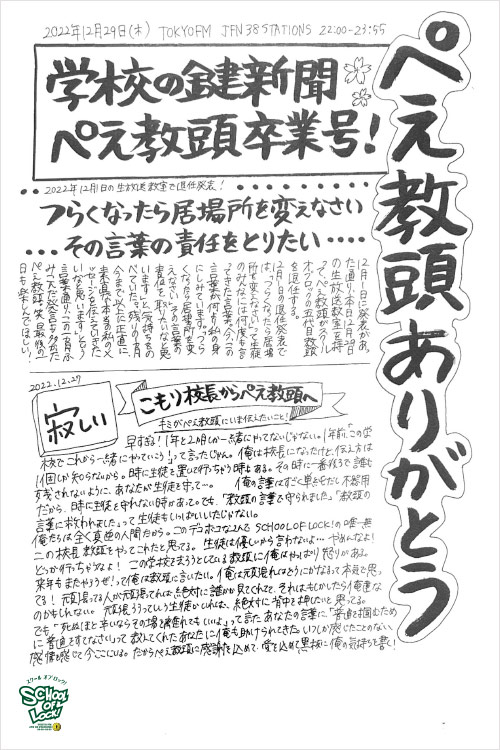 今夜は、ぺえ教頭がSCHOOL OF LOCK!を退任する日。時間の許す限り、キミと教頭が話をする授業。