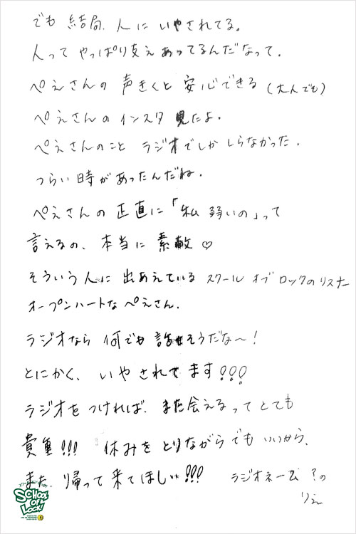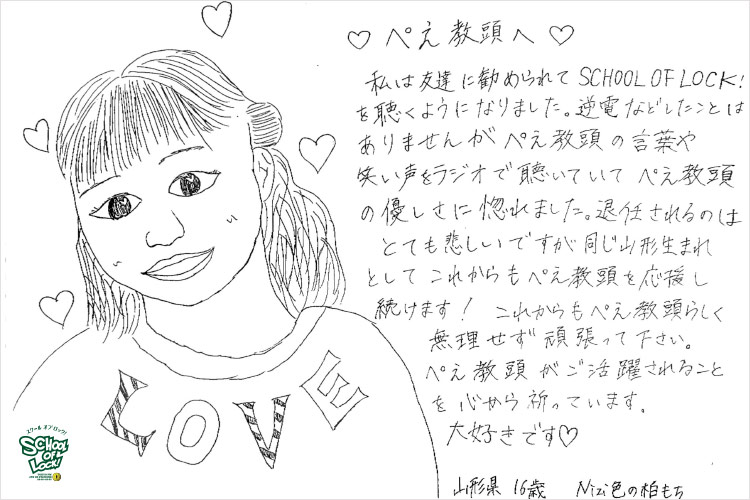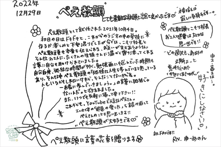 人生で初めて聴いたラジオがSCHOOLOFLOCK!で、初めて聴いた声がその日、教頭に就任したぺえ教頭の声だったそう。毎日、受験でいっぱいいっぱいになっている時に、ぺえ教頭の言葉に救われているとのこと。 涙ながらに言葉を届けてくれたRN.『まさ、』の声と想いを聞いたぺえ教頭も、大粒の涙を流してその思いに応えていました。