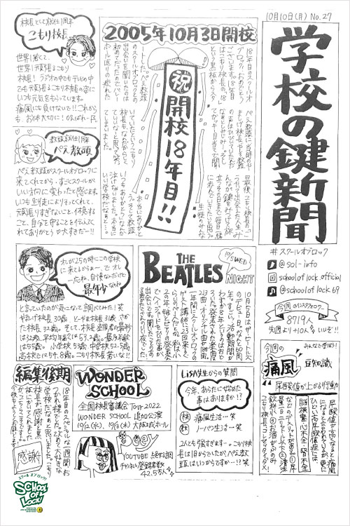 こもり校長「SCHOOL OF LOCK!、今夜も時間の許す限り生徒と電話繋いでいきます。生徒の君がぺえ教頭に伝えたいことを伝えたり、これまでの1年と3か月の間にぺえ教頭の言葉から何かを受け取った生徒、過去に逆電したことがある生徒はその思い出でもいい、学校掲示板に書き込んでほしい。SCHOOL OF LOCK!、開校です!」