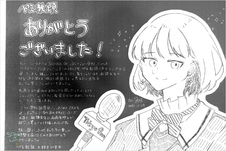 ラジオの中の学校、TOKYO FMの番組「SCHOOL OF LOCK!」(月曜〜木曜 22:00〜23:55/金曜 22:00〜22:55)。12月29日(木)の放送では、この日をもって退任するパーソナリティのぺえ教頭に向けて、リスナーから感謝の言葉が届けられました。 後編の記事では、ぺえ教頭からのリスナーへのメッセージと、1年3ヵ月の間、ぺえ教頭とともに番組を支えてきたこもり校長(小森隼/GENERATIONS from EXILE TRIBE)からのはなむけの言葉を紹介します。