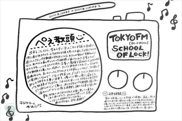 まさ、「人生初めて聴いたラジオがSCHOOL OF LOCK!で。それがちょうど初めて聴いた日が、ぺえ教頭が就任の日で、そこから毎日聴いて」