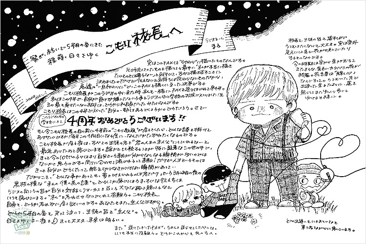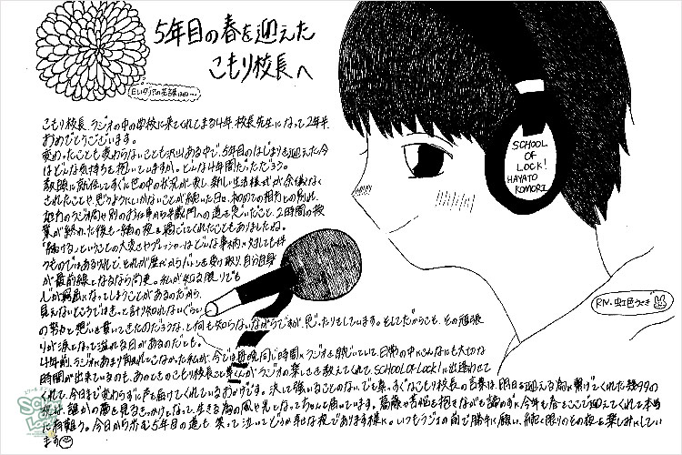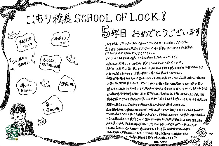 こもり校長「SCHOOL OF LOCK!にはずっと通ってくれてたけど、掲示板は、5年目にしてようやく初書き込み! 嬉しい! 何が嬉しいって、俺と同じ年数、SCHOOL OF LOCK!に通ってるっていう。5年間ってところに勝手にリンクしちゃう、このお節介お兄さんです」